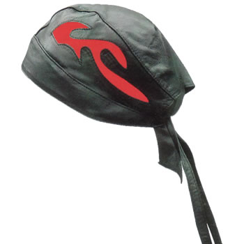 Black Leather motorcycle rider skull cap with red leather flame design inset.