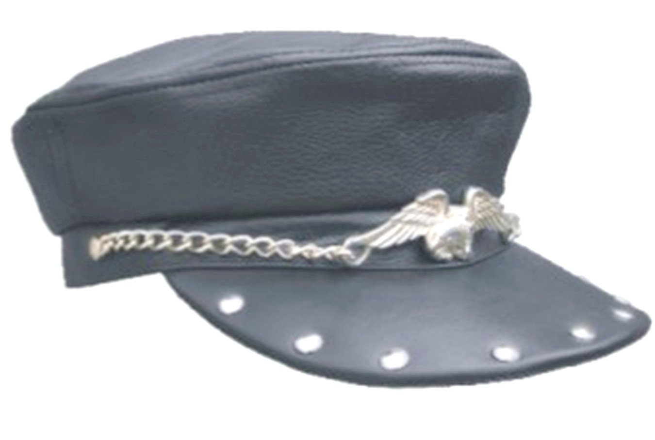 This black cowhide leather biker cap/hat has a flying eagle medallion and chain on rim and the sun visor is adorned with silver studs.