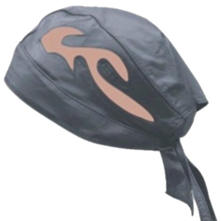 Black Leather motorcycle rider skull cap with brown leather flame design inset.