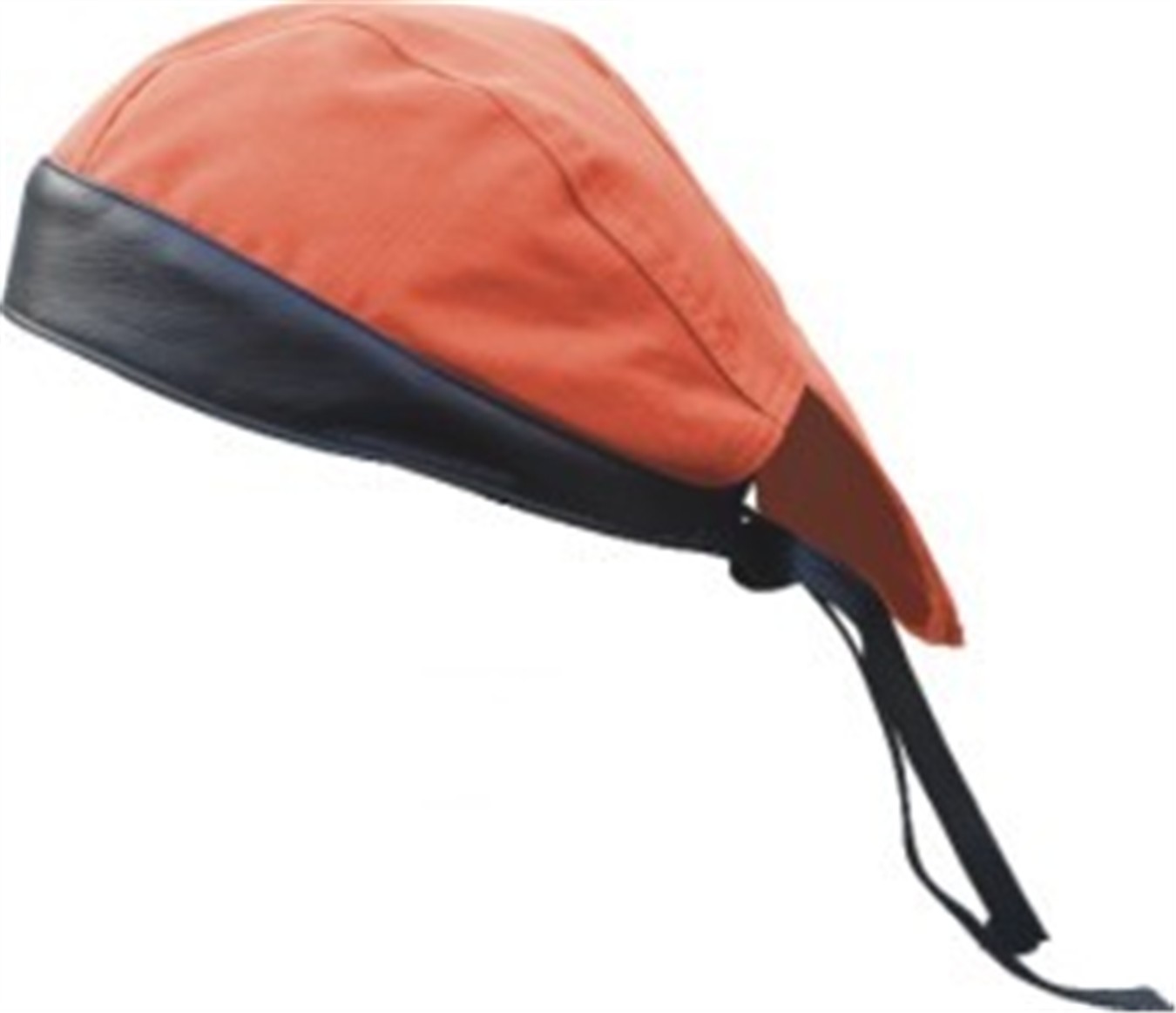 This orange denim motorcycle rider skull cap is trimmed with a black leather band, tail and ties.