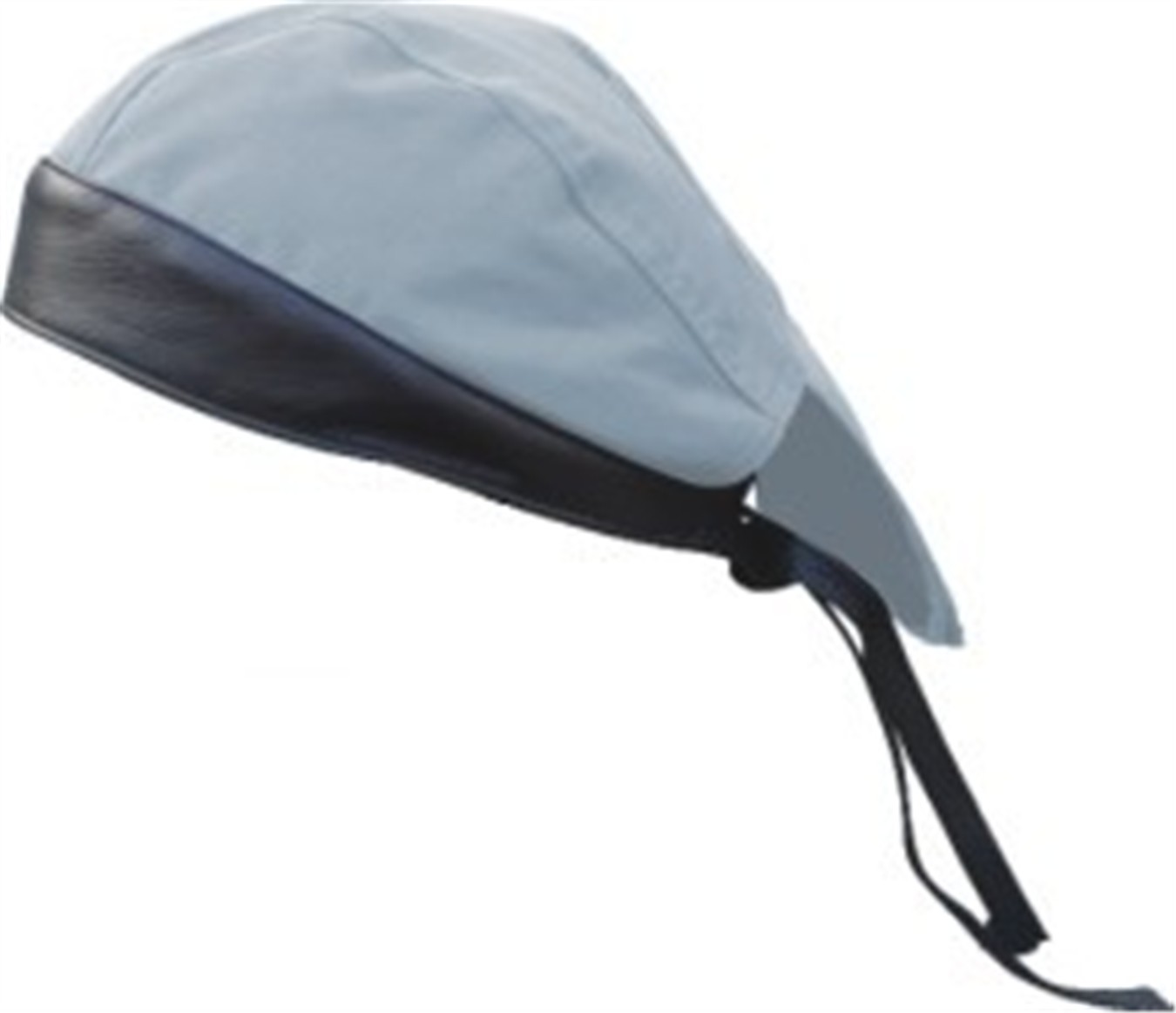 This light blue denim motorcycle rider skull cap is trimmed with a black leather band, tail and ties.