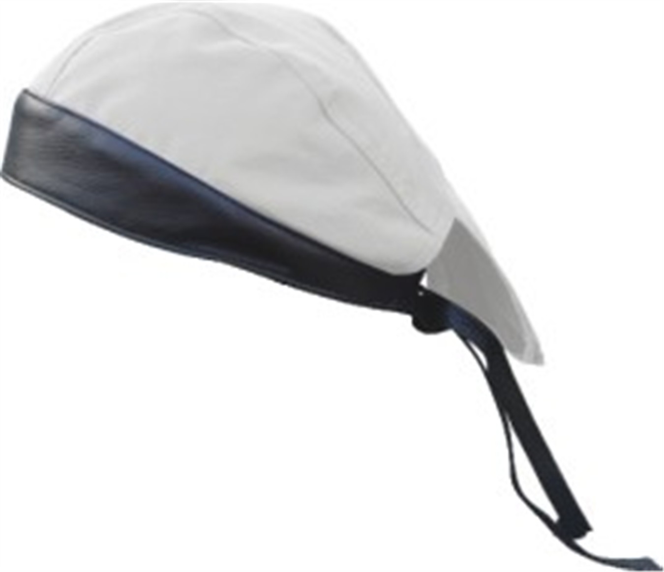 This Off White denim motorcycle rider skull cap is trimmed with a black leather band, tail and ties.
