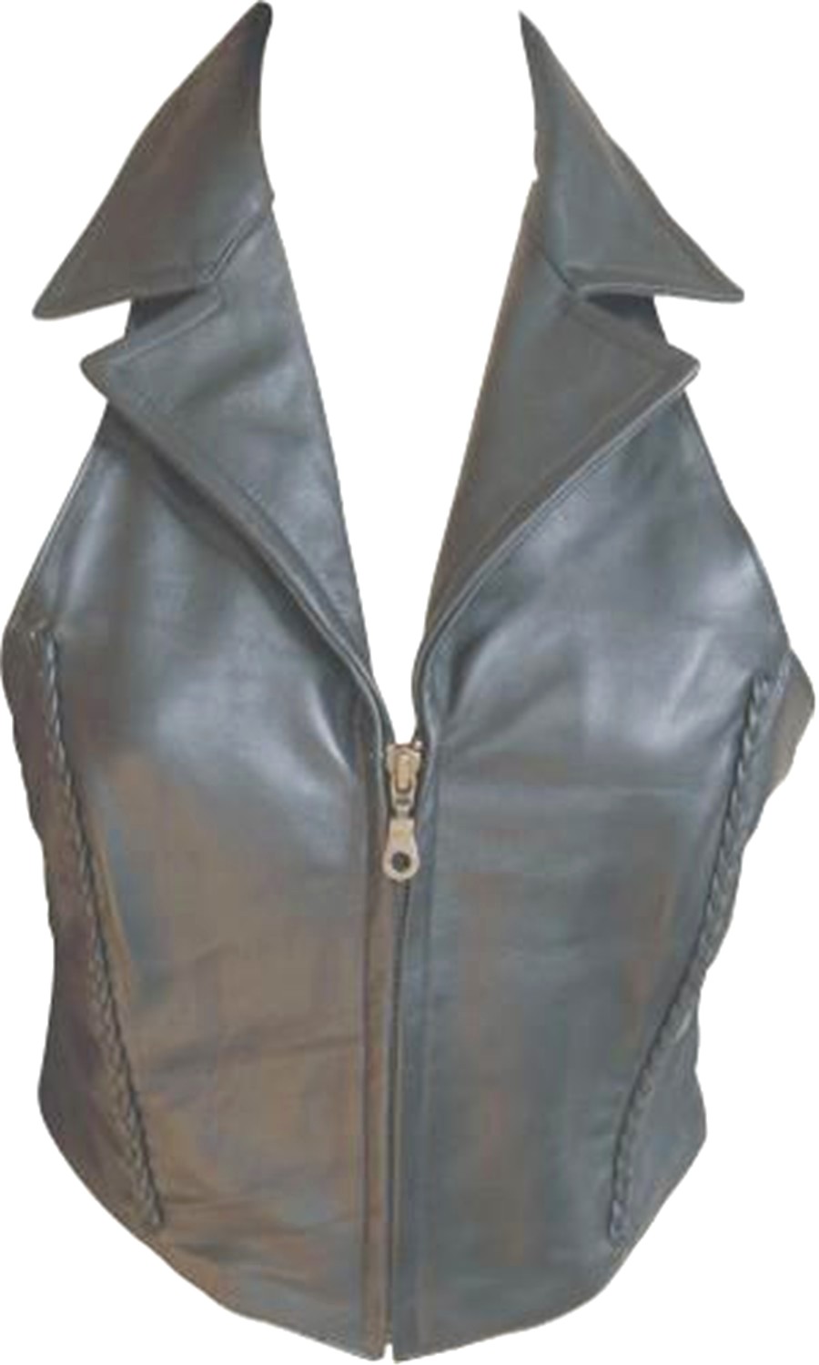 This black leather halter top is made from lambskin leather, ultra soft to the touch. Fashioned with a shirt style collar and braided leather trim on the front. The stretch material sides allow for a comfortable fit. This sexy piece can be worn alone to show off the low halter back and lattice design or with a jacket! The front zips up with a heavy duty YKK brand zipper.