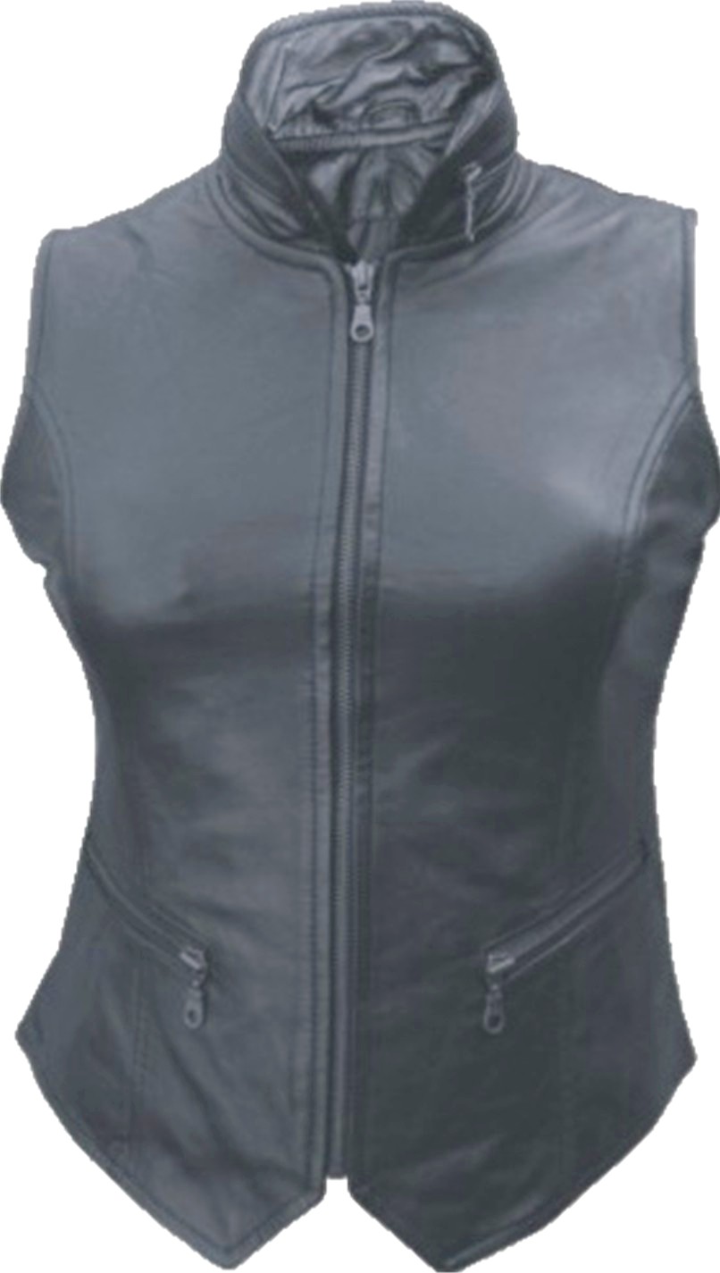 This black leather vest is made from lambskin leather for a smooth, supple feel. The zippered collar offers flexibility in styling. The longer length is great for those who have a long torso. The two zippered pockets in the front keep the contents safe.