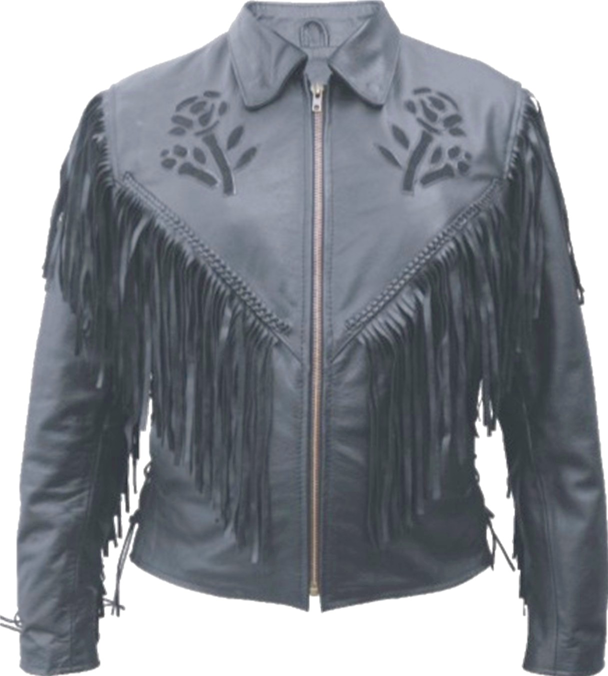 Ladies Black Rose Jacket with Fringe & Braid Analine Cowhide – Sizes XS to 5XL