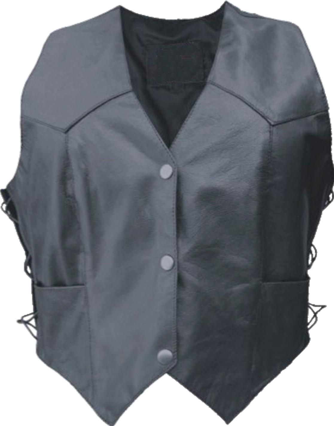 This black basic leather vest is made from lambskin leather for that ultra soft feel. Traditionally styled, this vest is fully lined, has snap closures. The side laces allow for a more custom, comfortable fit.