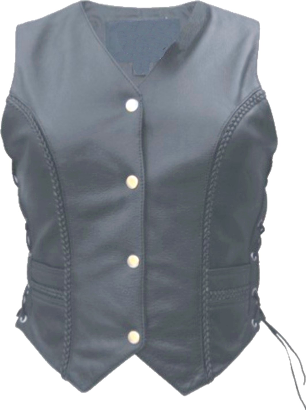 This classic black leather vest is made from water buffalo leather for durability & strength, yet has that “broken in” feel. Traditionally styled with attractive braided leather trim on the front and back. This vest is fully lined. The side laces are a great addition, allowing for a custom fit. This ladies biker vest has two front pockets, two inside pockets and front snap closure.