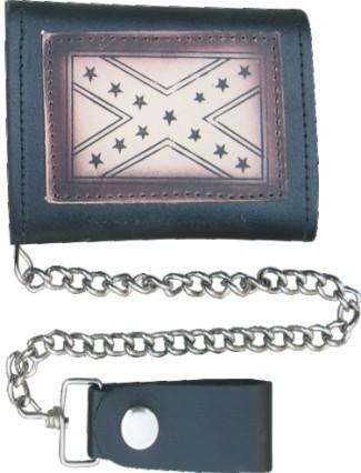 Black leather tri-fold biker chain wallet with rebel flag design.