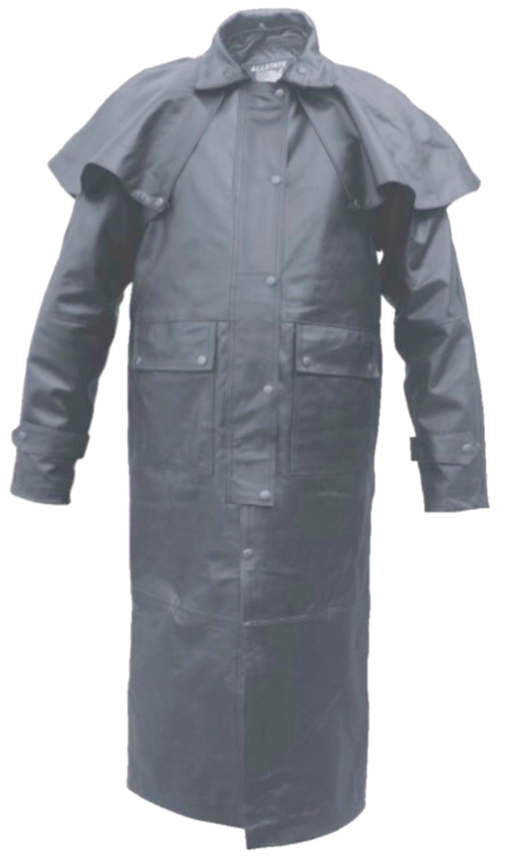 This black leather duster is made from split cowhide leather for durability and strength. This handsome outback style duster is perfect for bikers, as it has a split in the back to accommodate the bike and leg straps to secure the jacket while your riding. You can wear this duster with or without the cape as it is removable. The zip-out liner makes this a great jacket for all seasons. The zippers are all heavy duty YKK zippers.
