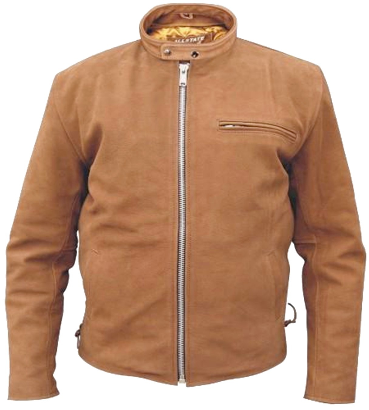 This brown leather jacket is made from distressed water buffalo leather for durability and strength, yet has that "broken in" feel. This biker jacket is fashioned in the touring/scooter jacket style with a stand up Euro collar and zippered closures on the wrists. The side laces offer a custom fit. The zip out liner makes this a great jacket for all seasons. The zippers are YKK brand.