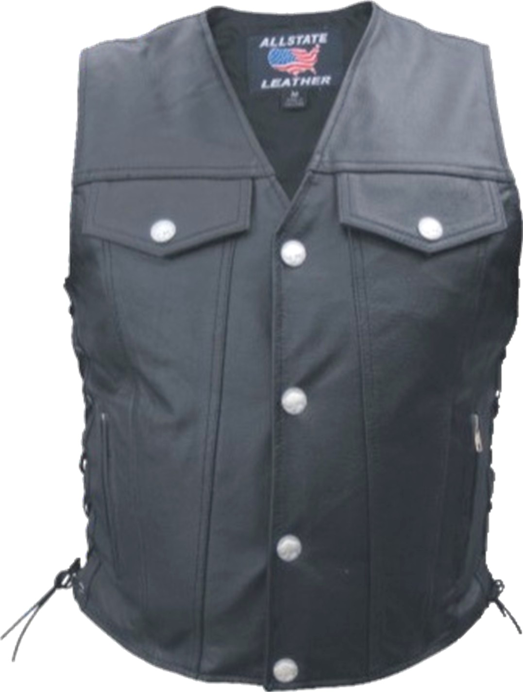 This black leather vest is made from Analine cowhide for uniformity of color and durability. It is designed in the traditional denim vest style. The highlight of this vest is the buffalo head snaps. The front has four pockets and two inside pockets. The side laces allow for a custom, comfortable fit. This vest is a great addition to any man’s wardrobe.
