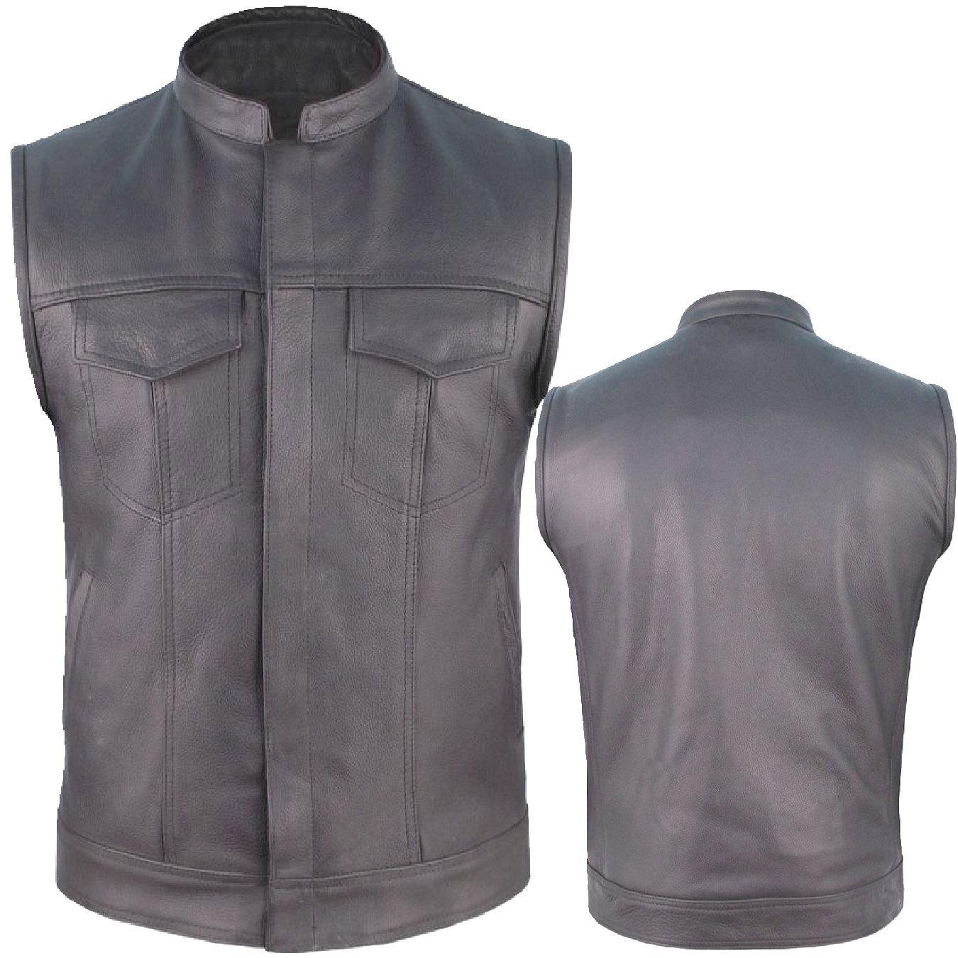 This vest gets its inspiration and attitude from the hit TV series, Sons of Anarchy. This black leather vest is made from Top Grade naked cowhide for durability and wear. Top grade cowhide leather is very soft, makes the vest have that already "broken in" feel to it. It is designed in the traditional outlaw biker style with a single panel back for ease in adding a club patch. This vest features a stand up collar, hidden snap closure front and two chest pockets and two "hand warmer" style pockets on the front. The highlight of this vest is the generous sized lined gun pockets on the right and left inside for safe and discreet transport of your firearm.