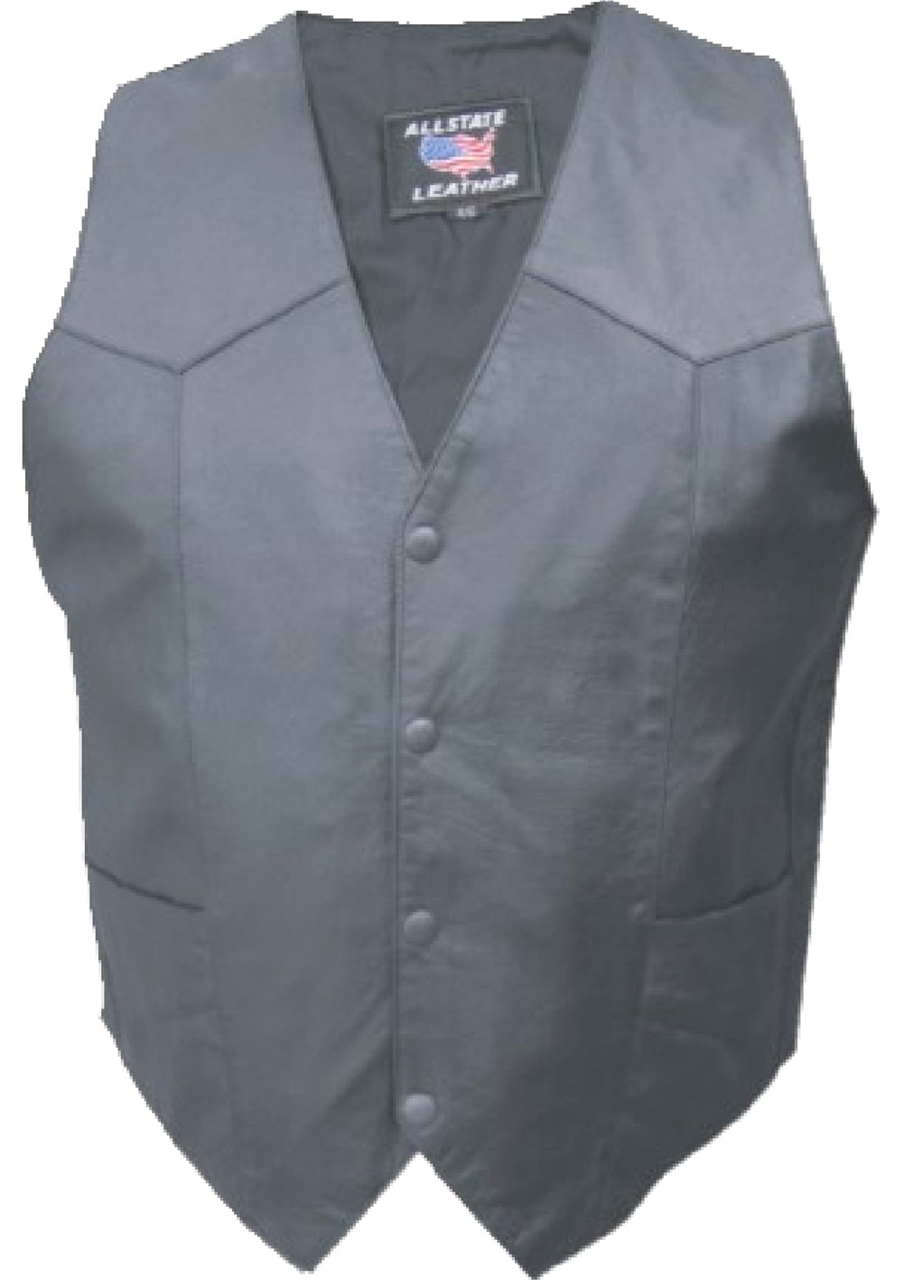 This affordable black leather vest is made from goat skin leather for that ultra soft feel. This biker vest has two front pockets, two inside pockets and front snap closure.
