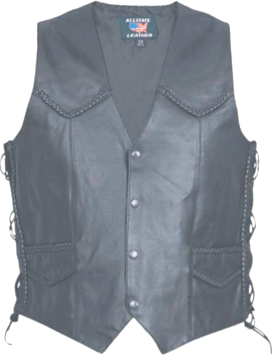This black leather motorcycle vest is made from split cowhide leather for durability and strength. This biker vest is trimmed in braided leather and has two front pockets, two inside pockets and front snap closure. The side laces offer a customized comfortable fit.