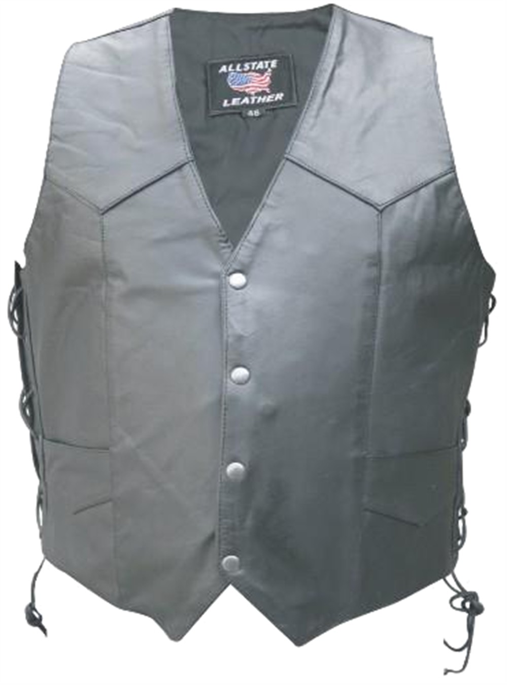 This black leather vest is made from water buffalo leather for durability and strength, yet maintains a "broken in" soft feel. It is designed in the traditional biker style with a single panel back for ease in adding a club patch. The highlight of this vest is the leather lined gun pockets on the right and left inside for safe and discreet transport of your firearm. The front has pockets and a snap closure. The side lacing allows for a custom, comfortable fit.
