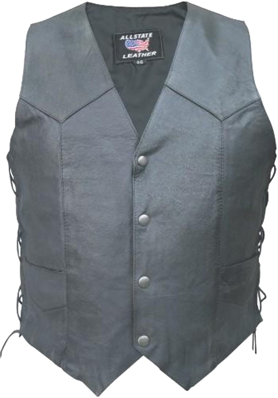 This black leather vest is made from Split Cowhide for durability and strength. It is designed in the traditional biker style. Budget priced, this vest is a great addition to any man’s wardrobe. The front has two pockets and two inside pockets. The side laces allow for a custom, comfortable fit.