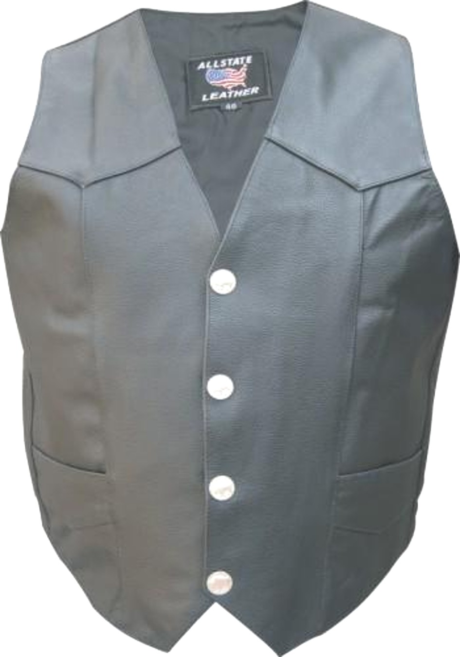 This black leather vest is made from Drum Dyed Naked Cowhide for uniformity of color and durability. It is designed in the traditional biker style. The highlight of this vest is the Buffalo Nickel style snaps. This vest is a great addition to any man’s wardrobe. The front has two pockets and two inside pockets.