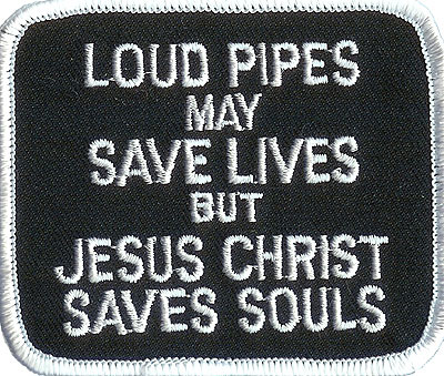 LOUD PIPES MAY SAVE LIVES BUT JESUS CHRIST SAVES SOULS - EMBROIDERED PATCH