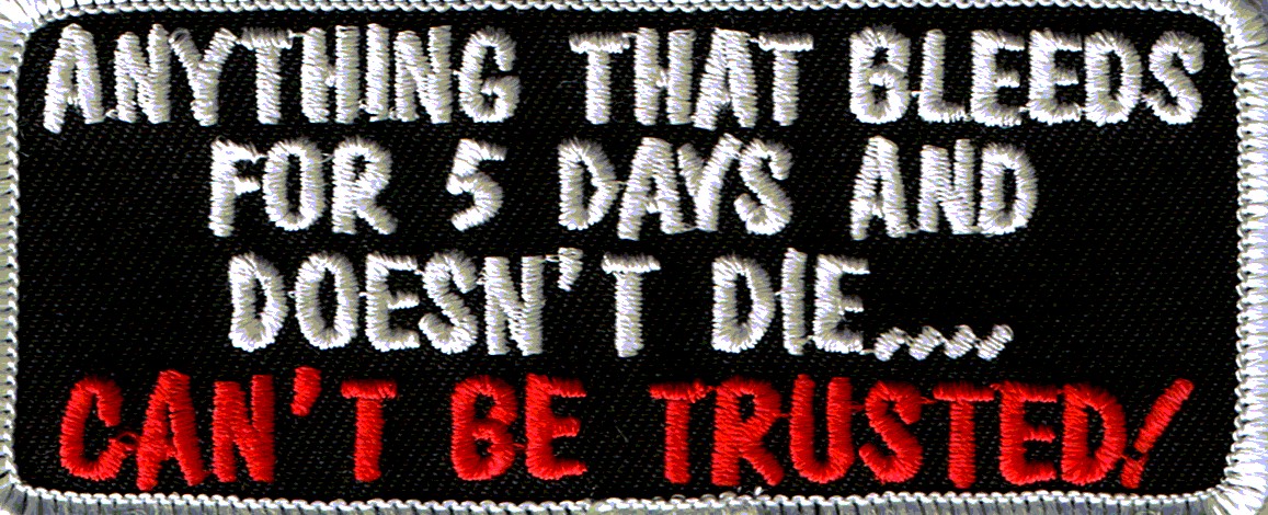 ANYTHING THAT BLEEDS FOR 5 DAYS AND DOESN'T DIE.. CAN'T BE TRUSTED! - EMBROIDERED PATCH