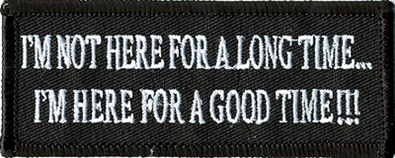 > I'M NOT HERE FOR A LONG TIME... I'M HERE FOR A GOOD TIME!!! - EMBROIDERED PATCH