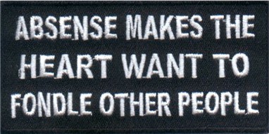 ABSENCE MAKES THE HEART WANT TO FONDLE OTHER PEOPLE - EMBROIDERED PATCH CLOSEOUT PRICED