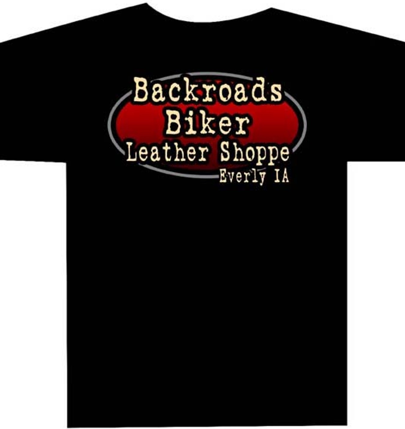 Backroads Biker Leather Shoppe, Everly IA design on the back and Backroads Biker on the front left chest of this black long sleeve T-Shirt made from 100% pre-shrunk cotton.