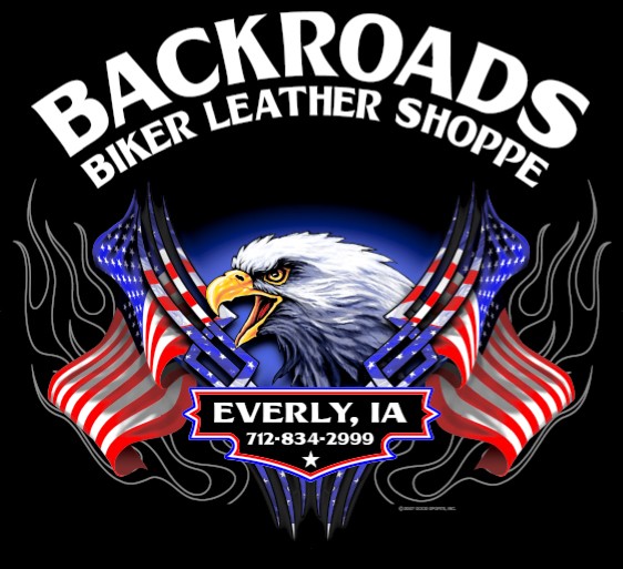 Our classic biker t-shirt style in 100% cotton. Durable construction and bright screen print Backroads Biker Leather Shoppe, Everly IA with American Flag, Eagle and Flame design on the back.