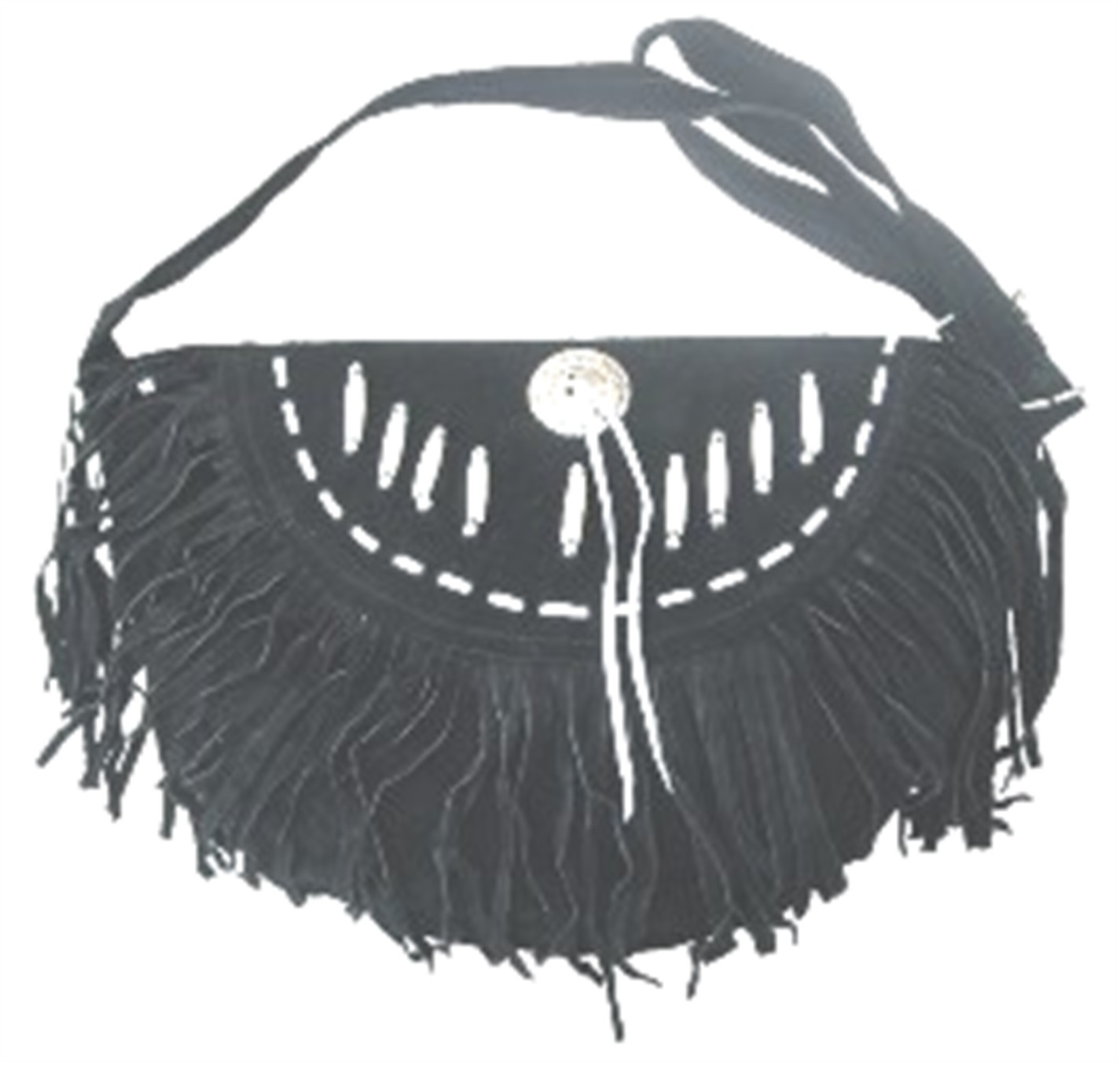 This shoulder bag is made from black suede-finished cowhide leather. Black fringe, white bone work, white leather lacing and a silver concho decorates the front.