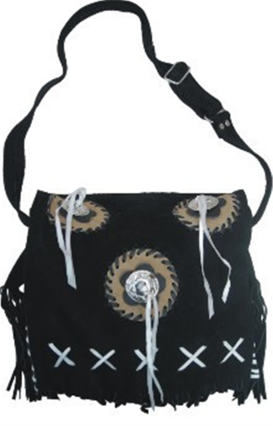 This shoulder bag is made from black suede-finished cowhide leather. black fringe, white leather lacing, Brown Suede circles and 3 silver conchos decorates the front.