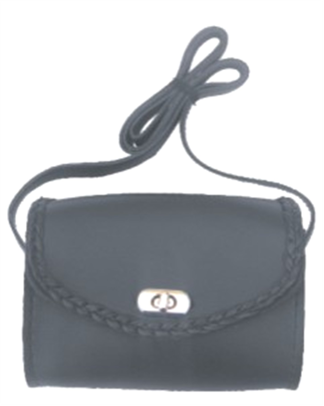 This purse is made from black PVC (synthetic leather). Braided trim design decorates the front. This cute little bag is a great accessory for all occasions.
