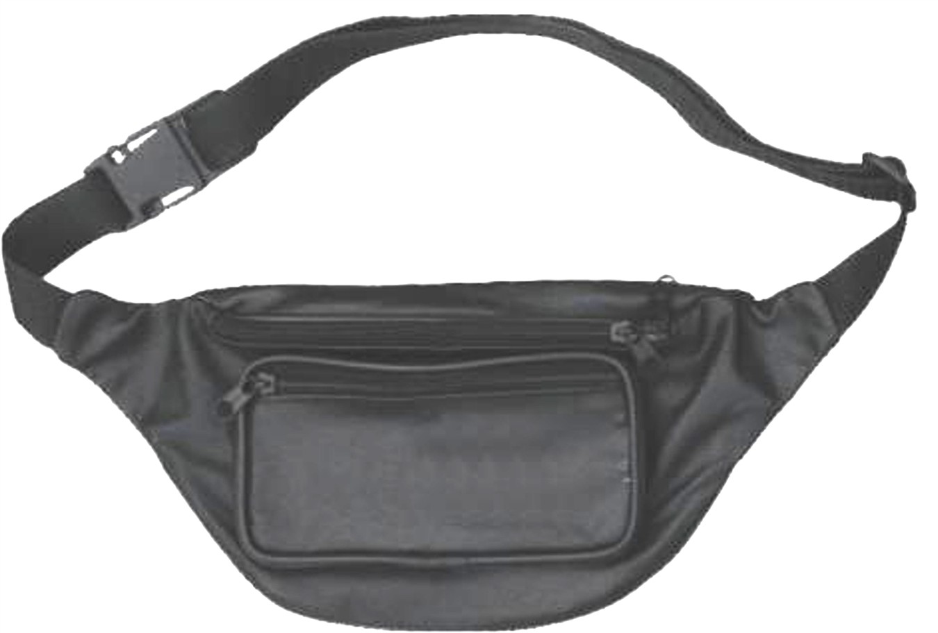 Leather Fanny bag with large zipper compartment and smaller zippered compartment on the front.