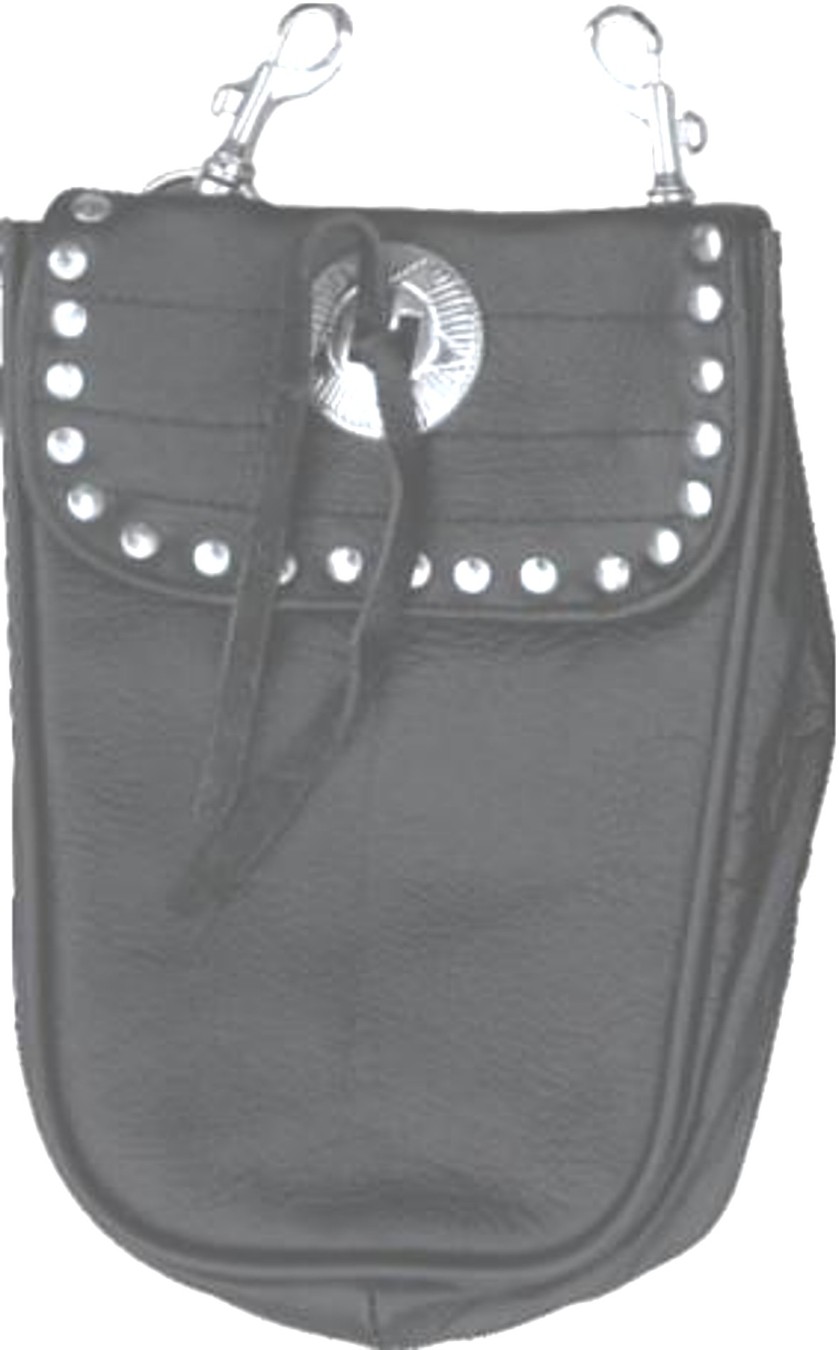 Black leather belt loop bag designed with a single concho adorning the front and silver studs decorating the hook & loop closure on main flap.