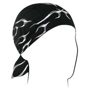 The ZANheadgear® Flydanna® is a bandanna that has been sectioned into 6 panels and transformed into a headwrap. By keeping sweat from a rider's eyes and preventing sweat and skin oils from soiling helmet liners, the Flydanna® works well as moisture barrier underneath a helmet. Additionally, the Flydanna® keeps hair from getting snagged on earrings or tangled in the wind. Black Tank Flame design. Material: 100% Cotton