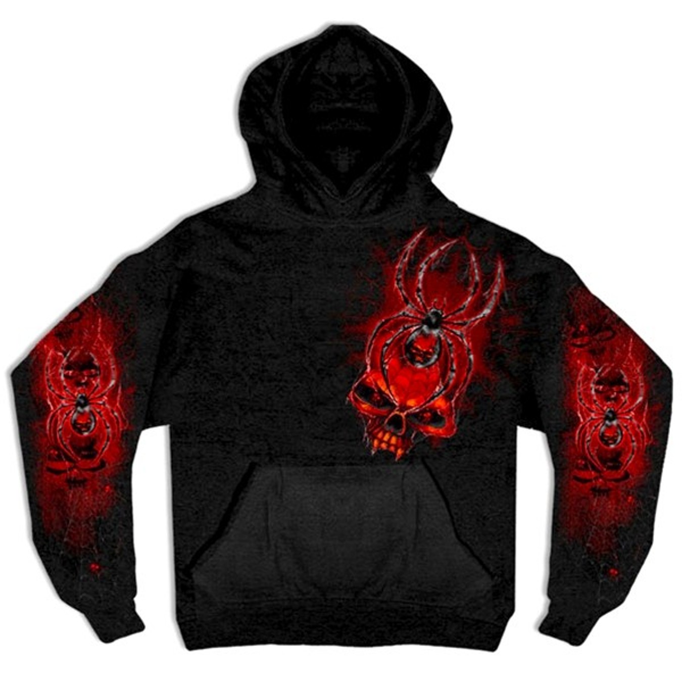 This black hoodie pull-over sweatshirt has a red spider and skull design printed on the front and both sleeves.