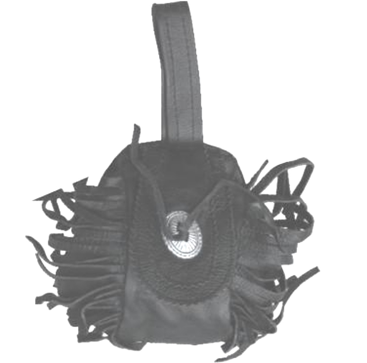 Clam shell shaped bag designed with an adjustable leather strap to secure to your belt.