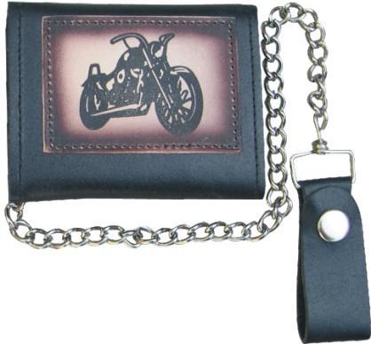Black leather tri-fold biker chain wallet with motorcycle design. Wallet is approximately 4 inches long.